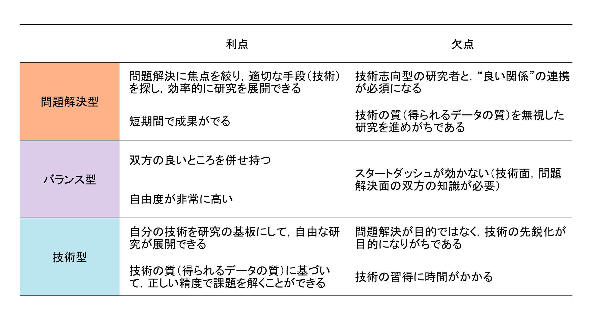 - 利点:問題解決に焦点を絞り,適切な手段(技術)を探し,効率的に研究を展開できる