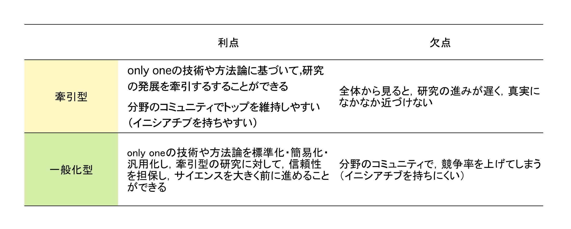 - 利点:only oneの技術や方法論を標準化・簡易化・汎用化し,牽引型の研究に対して,信頼性を担保し,サイエンスを大きく前に進めることができる