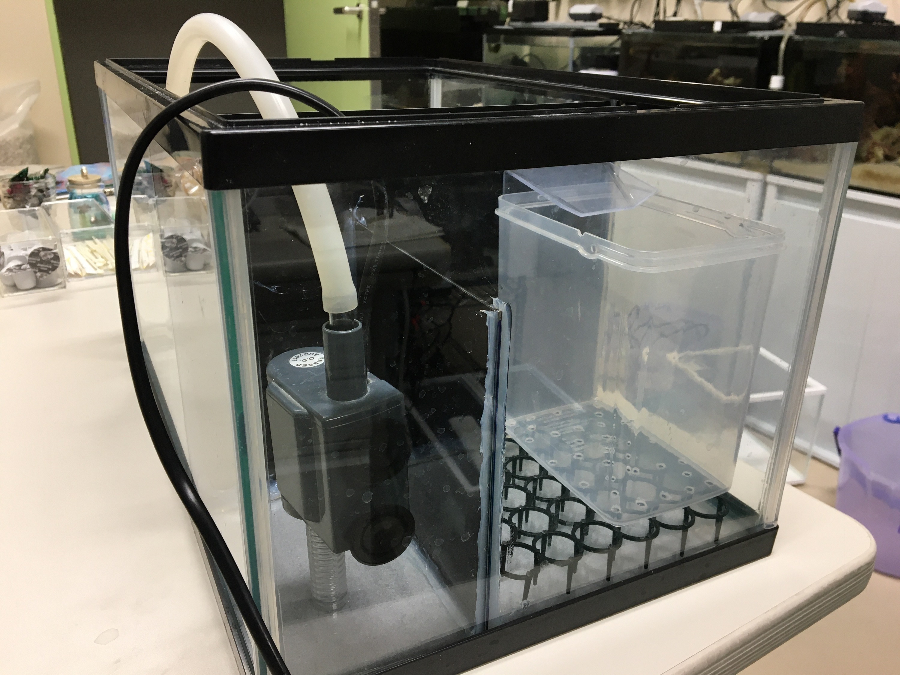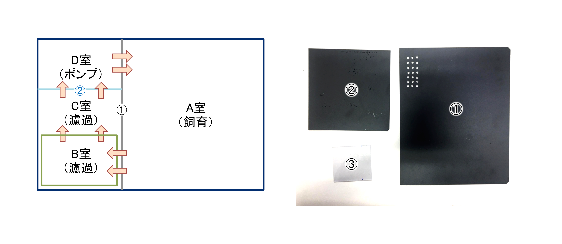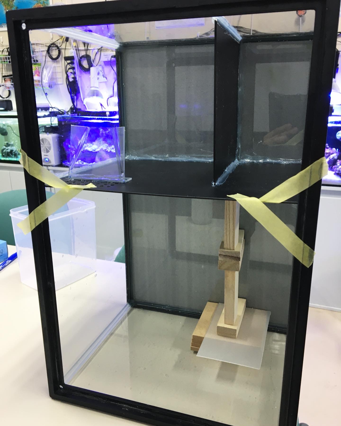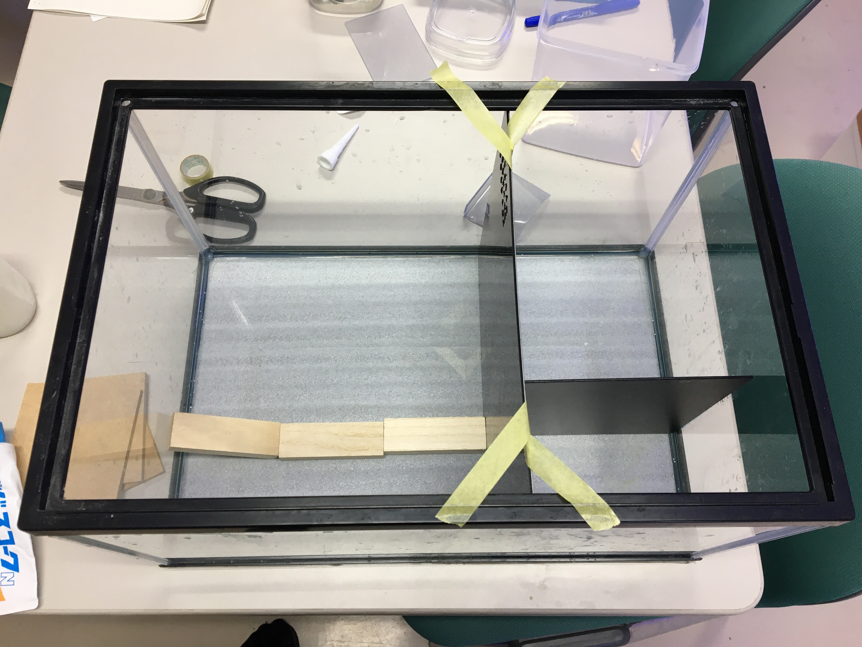 2. 完成した仕切り板を水槽内に設置し,接着剤で固定します(1週間程度,乾燥)。