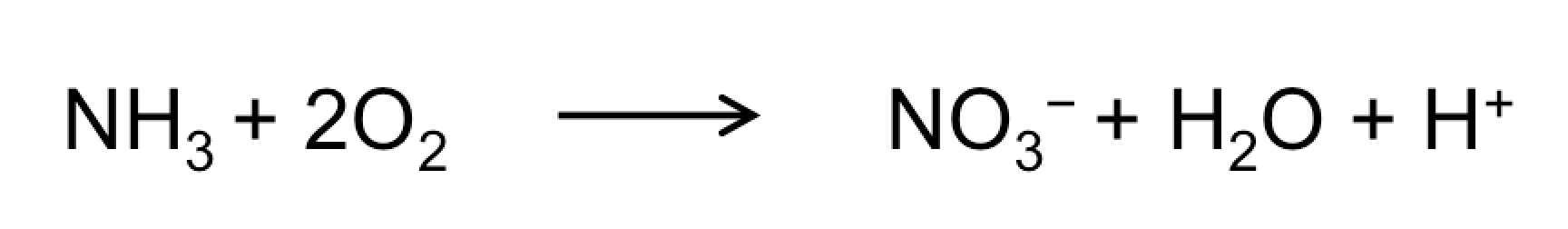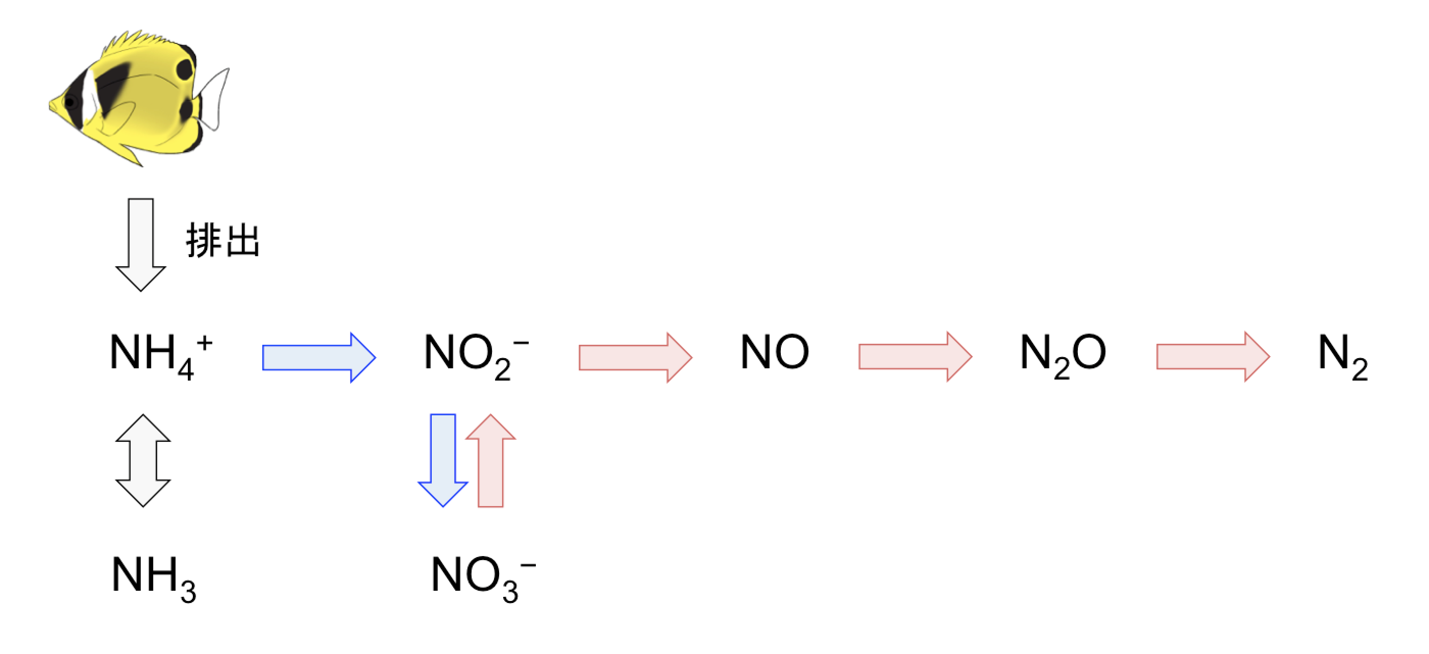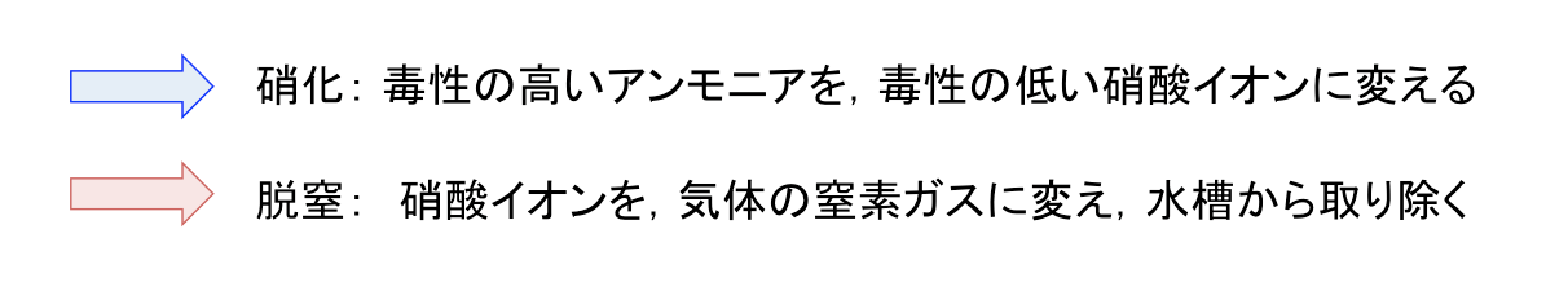 まず,生き物が排出したアンモニアは,アンモニア酸化菌(ニトロソモナス属の菌)によって亜硝酸イオン(アンモニアに比べて,約1/10の毒性)になります。さらに亜硝酸イオンは,亜硝酸酸化菌(ニトロバクター属の菌)によって,硝酸イオン(アンモニアに比べて,約1/100の毒性)になります。
