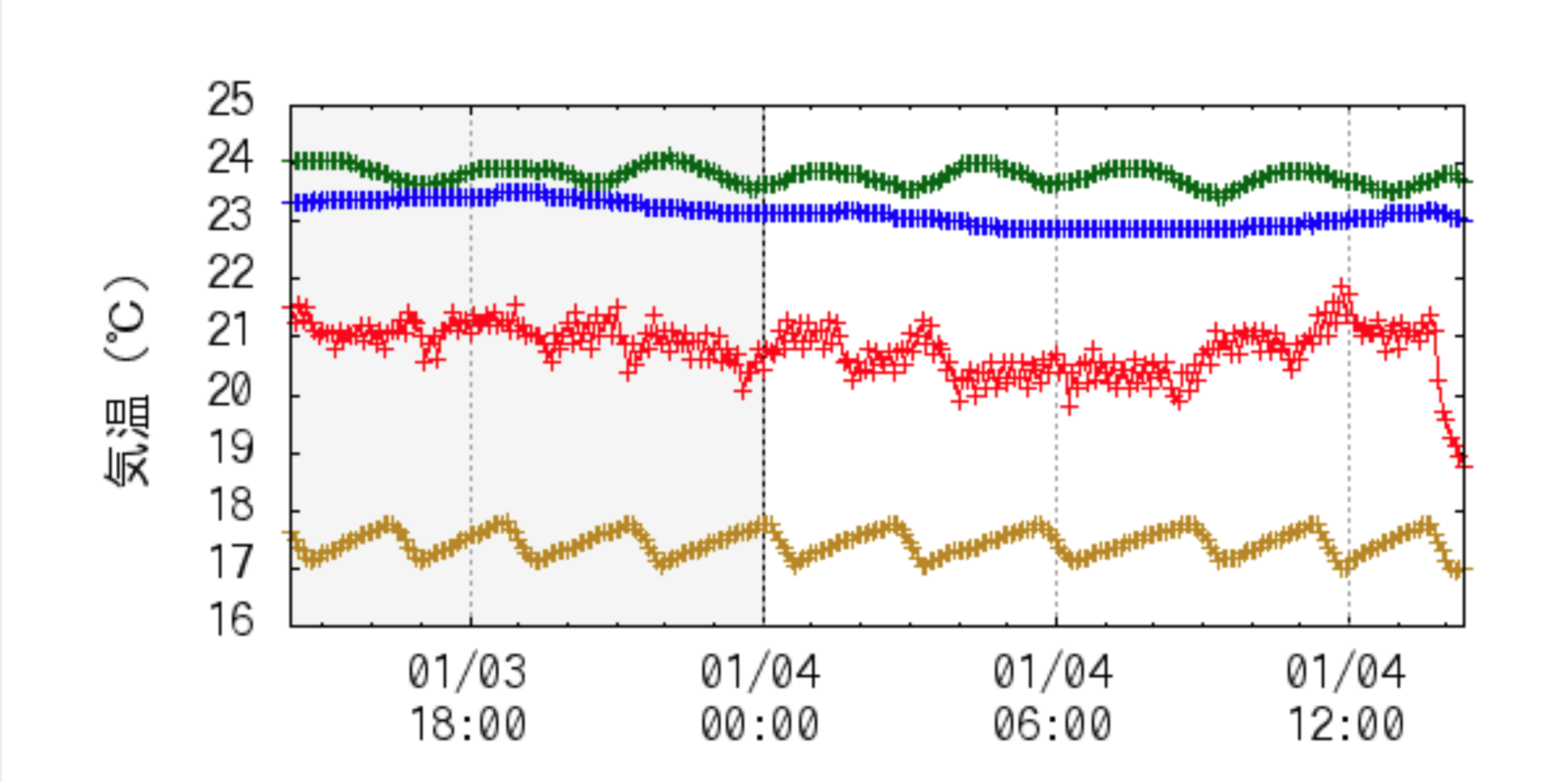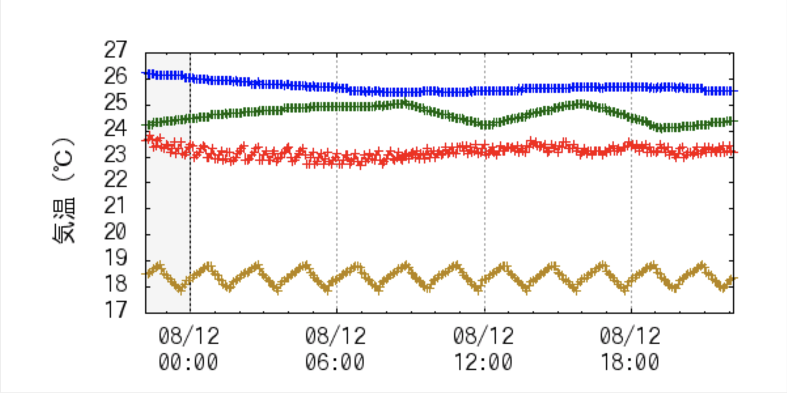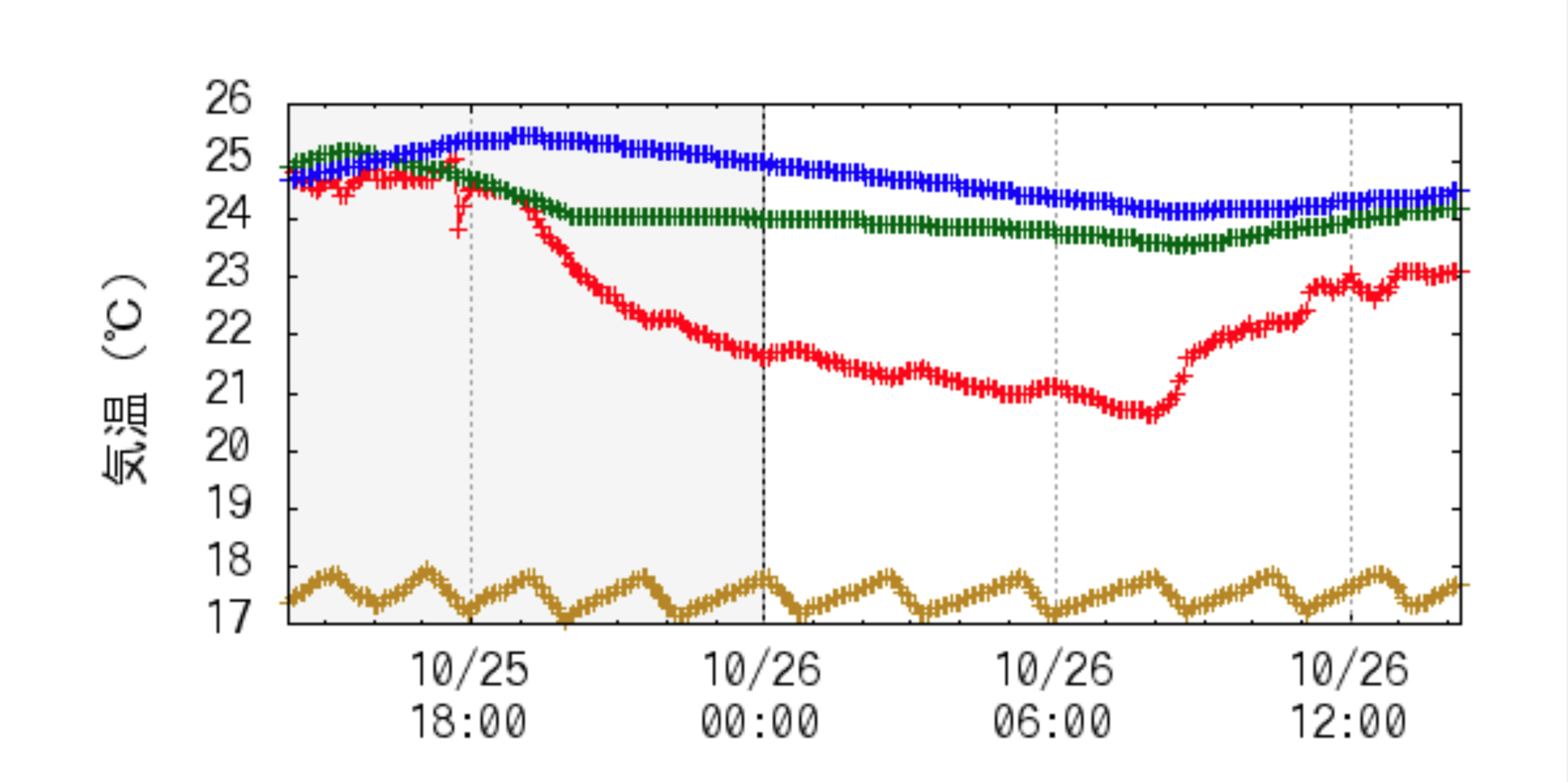 (赤:室温,緑:海水魚水槽,青:低塩分水槽,黄:低温水槽)