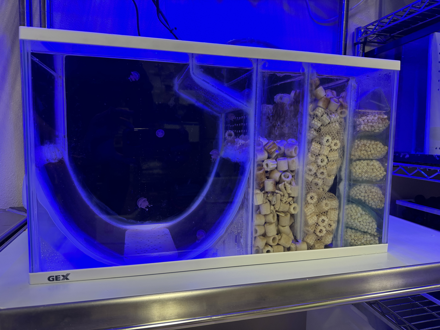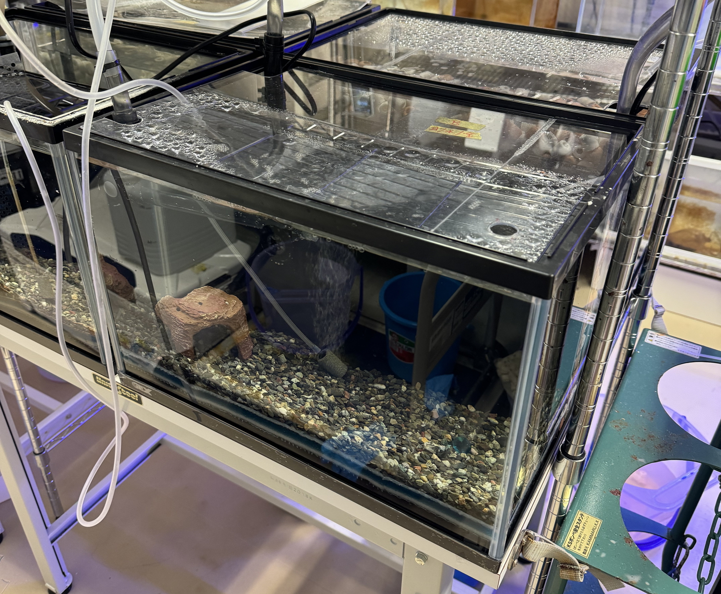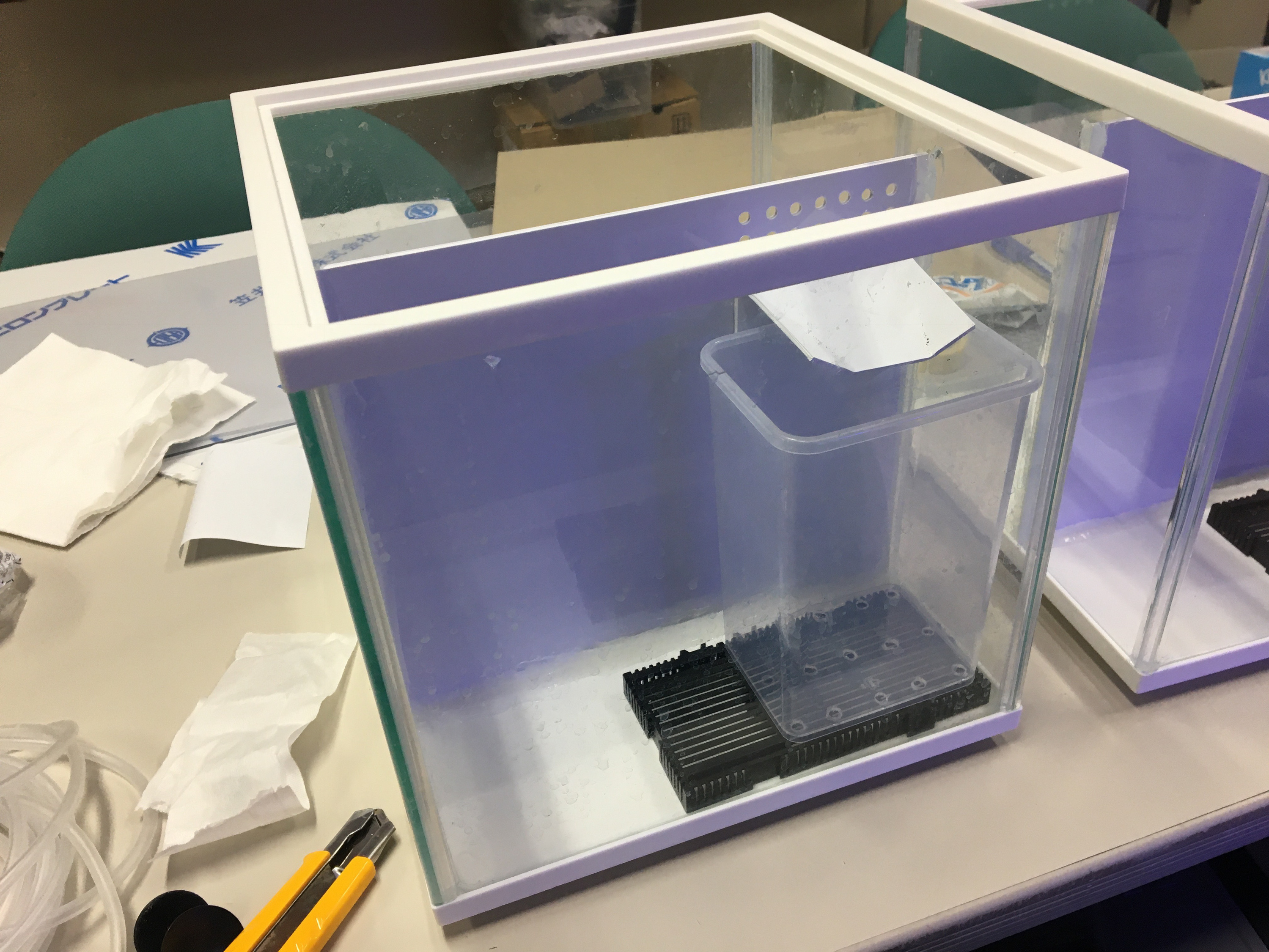 水槽の飼育水の浄化には,内部フィルター,底面フィルター,上部フィルター,外部フィルター,オーバーフロー+ろ過槽,背面ろ過などの様々な「浄化法」があり,当研究室では,研究の目的,対象種,飼育個体数,水替えの頻度,コストなどを考えて,様々な浄化法を使用しています。