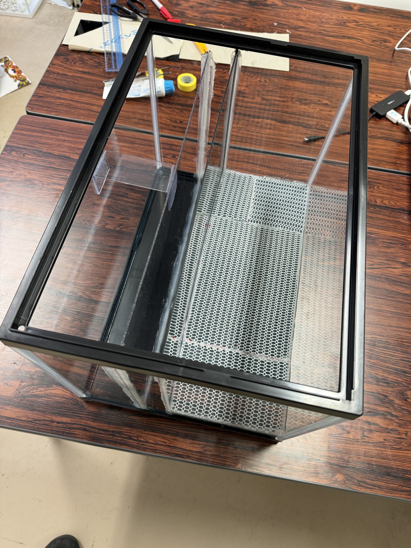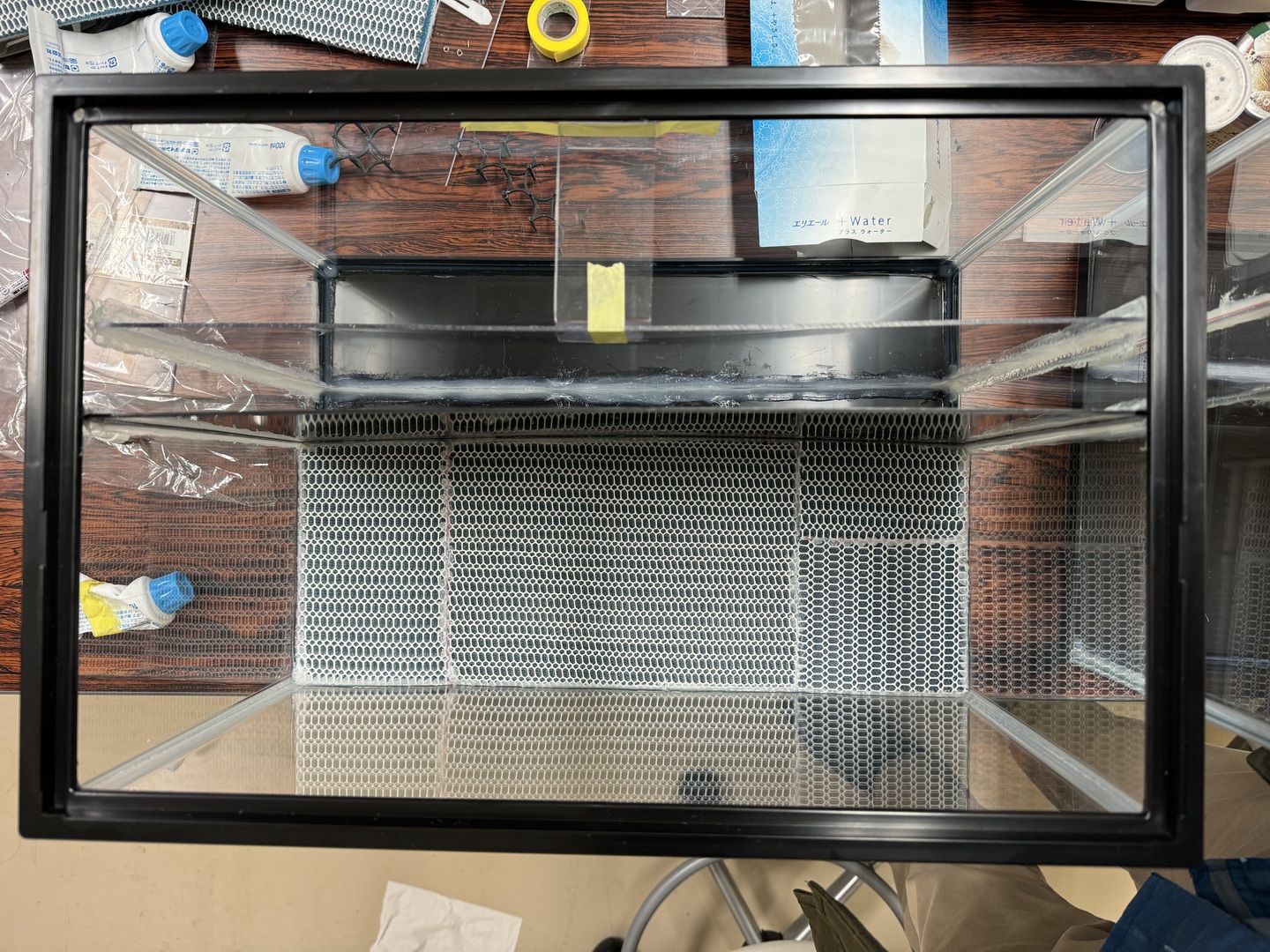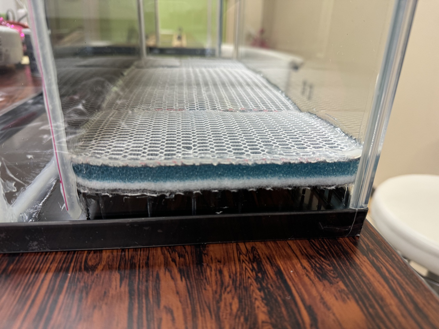 3. 飼育槽の底面に,水が通れるスペーサー(猫よけ対策のトゲトゲシートなど),濾過マットを入れて,飼育槽の底面から濾過槽に水が流れるようにします。