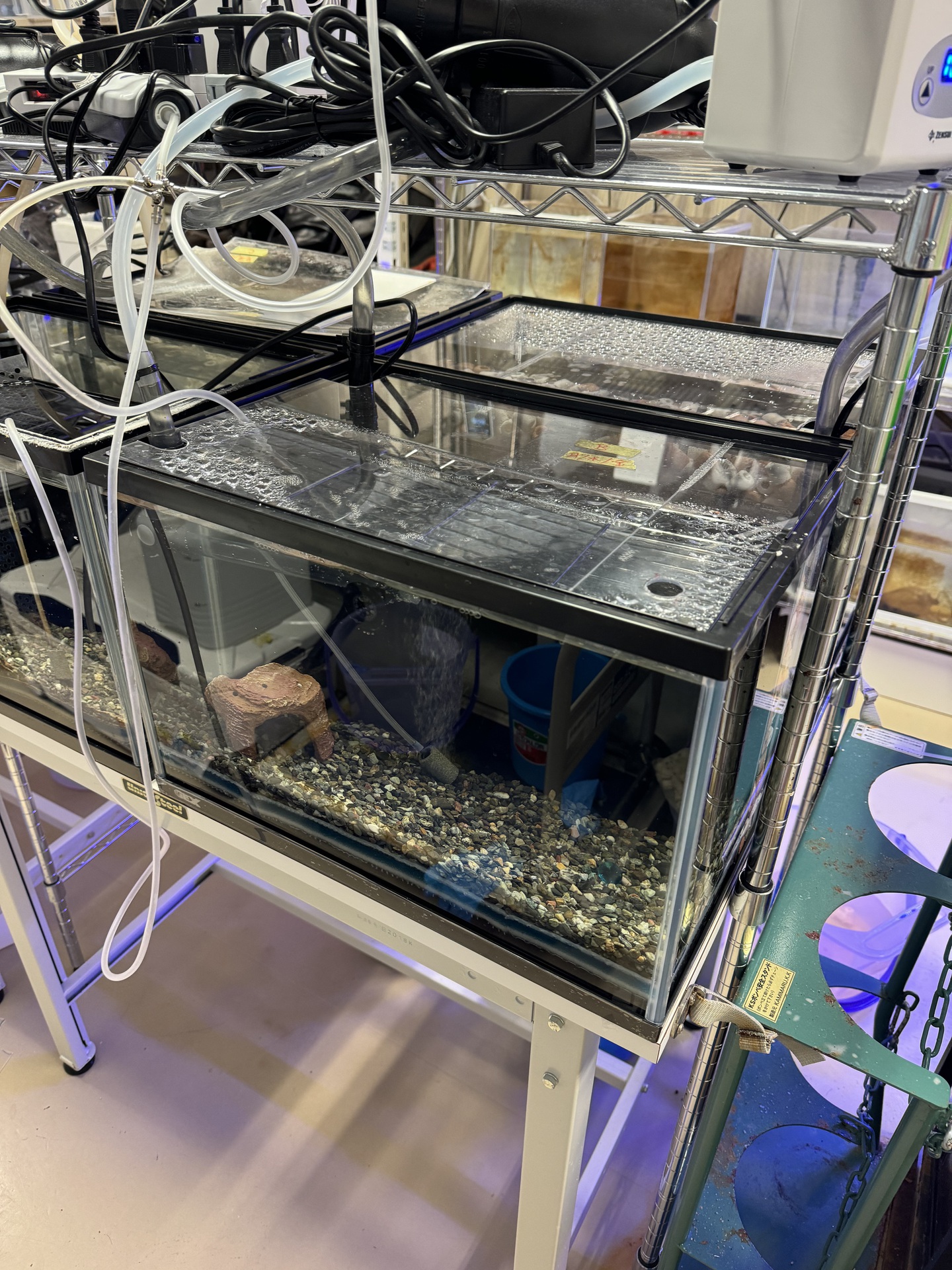 私達の研究室では,飼育槽→濾過槽→ポンプ室→UV殺菌灯→クーラー→飼育槽,という順番で,水が回るように設置することが多いです。