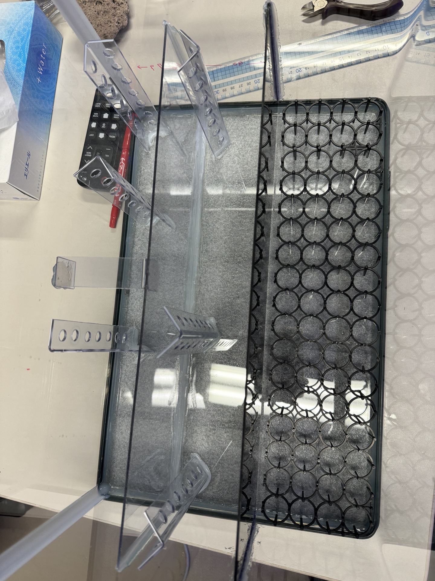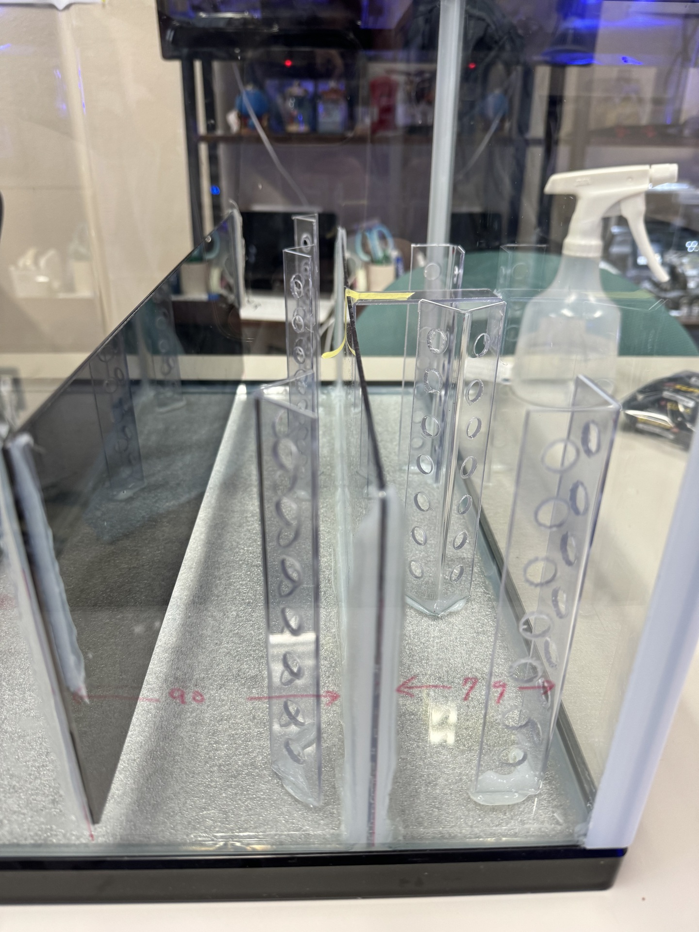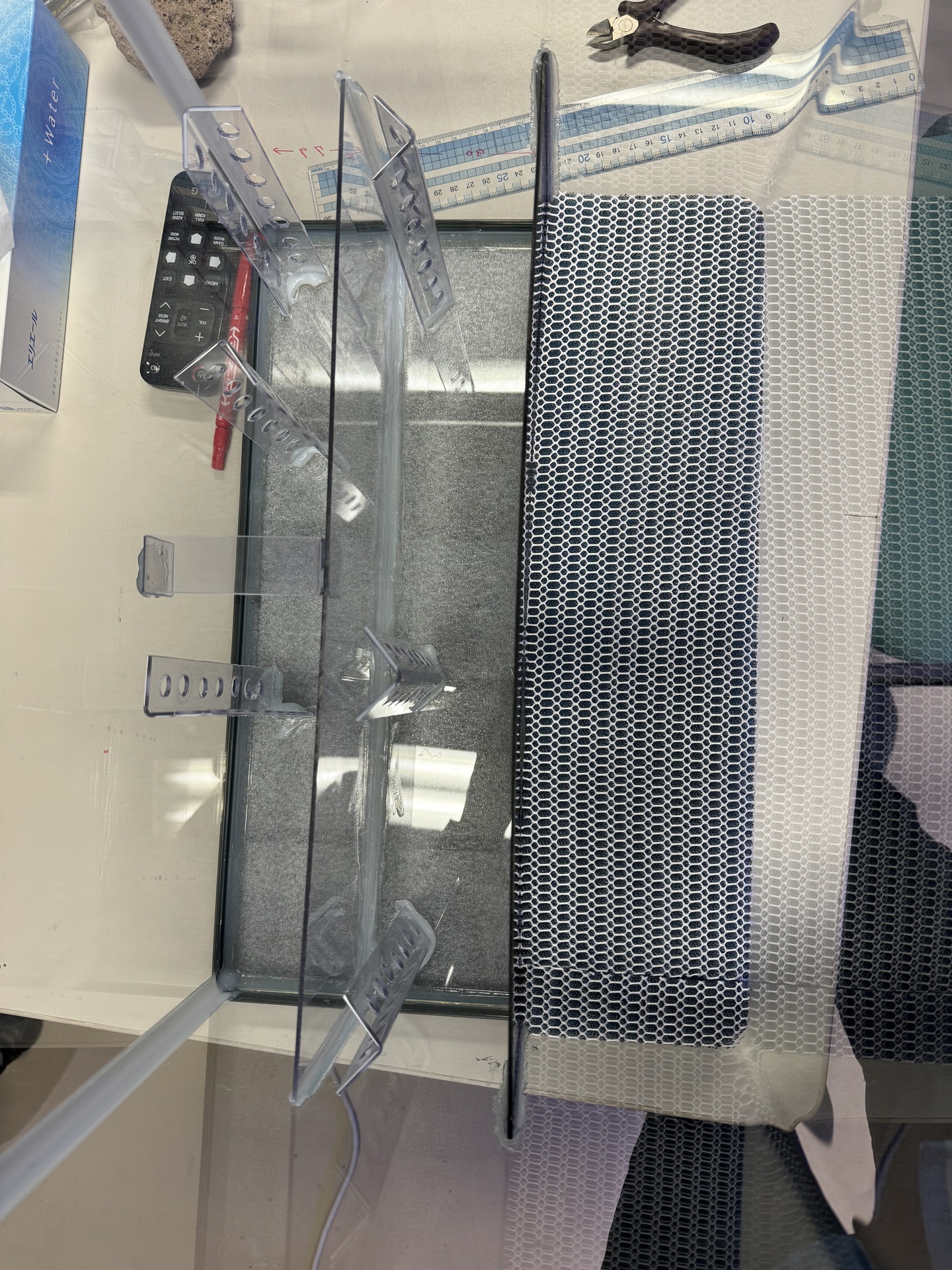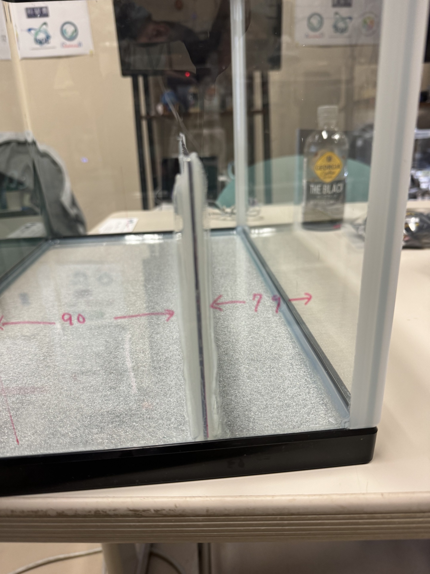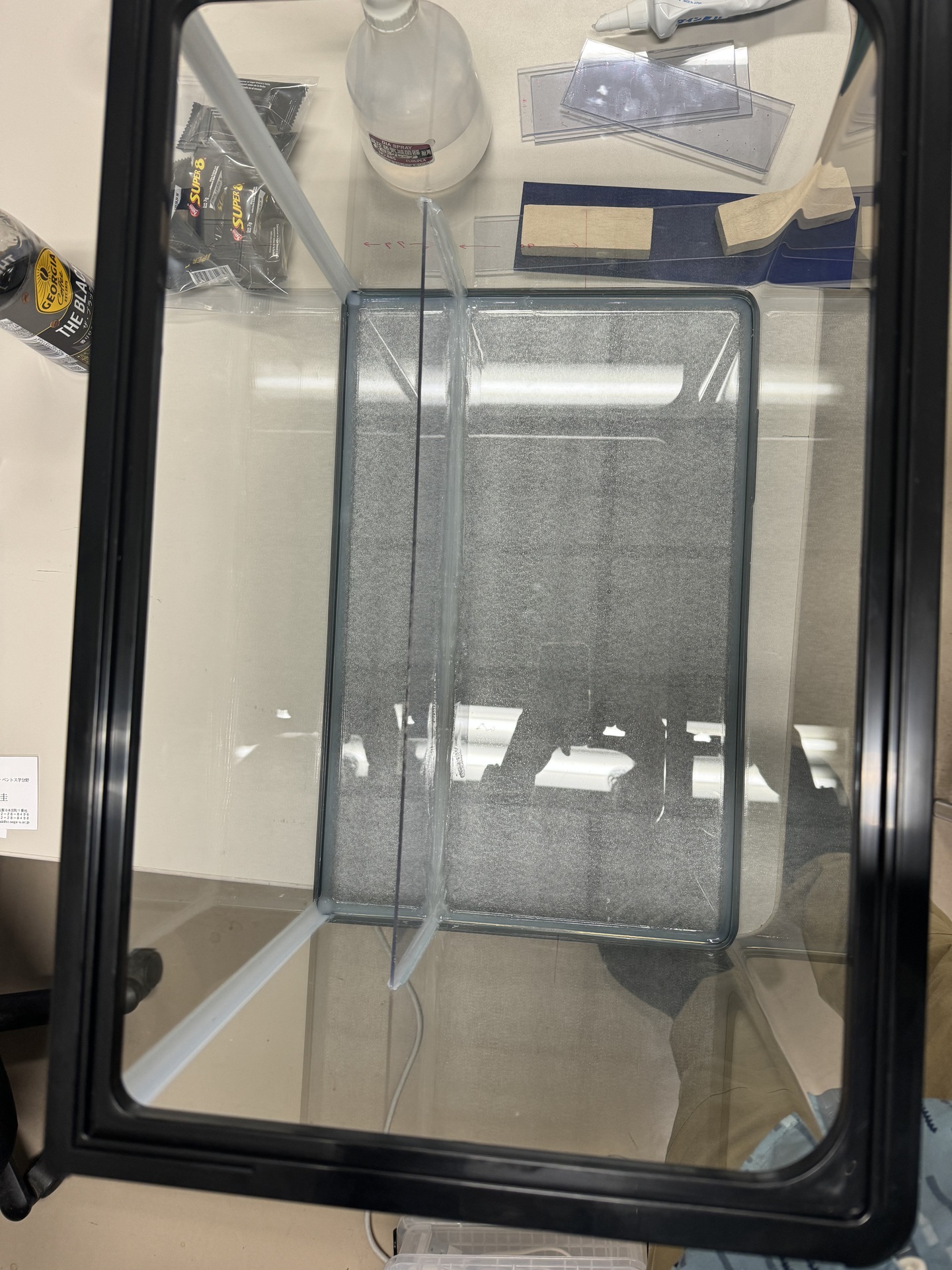 3. ④を水槽の背面から7.9cmの部分に接地し(接地の角は,あらかじめ少し削っておきます),接着材で固定します。