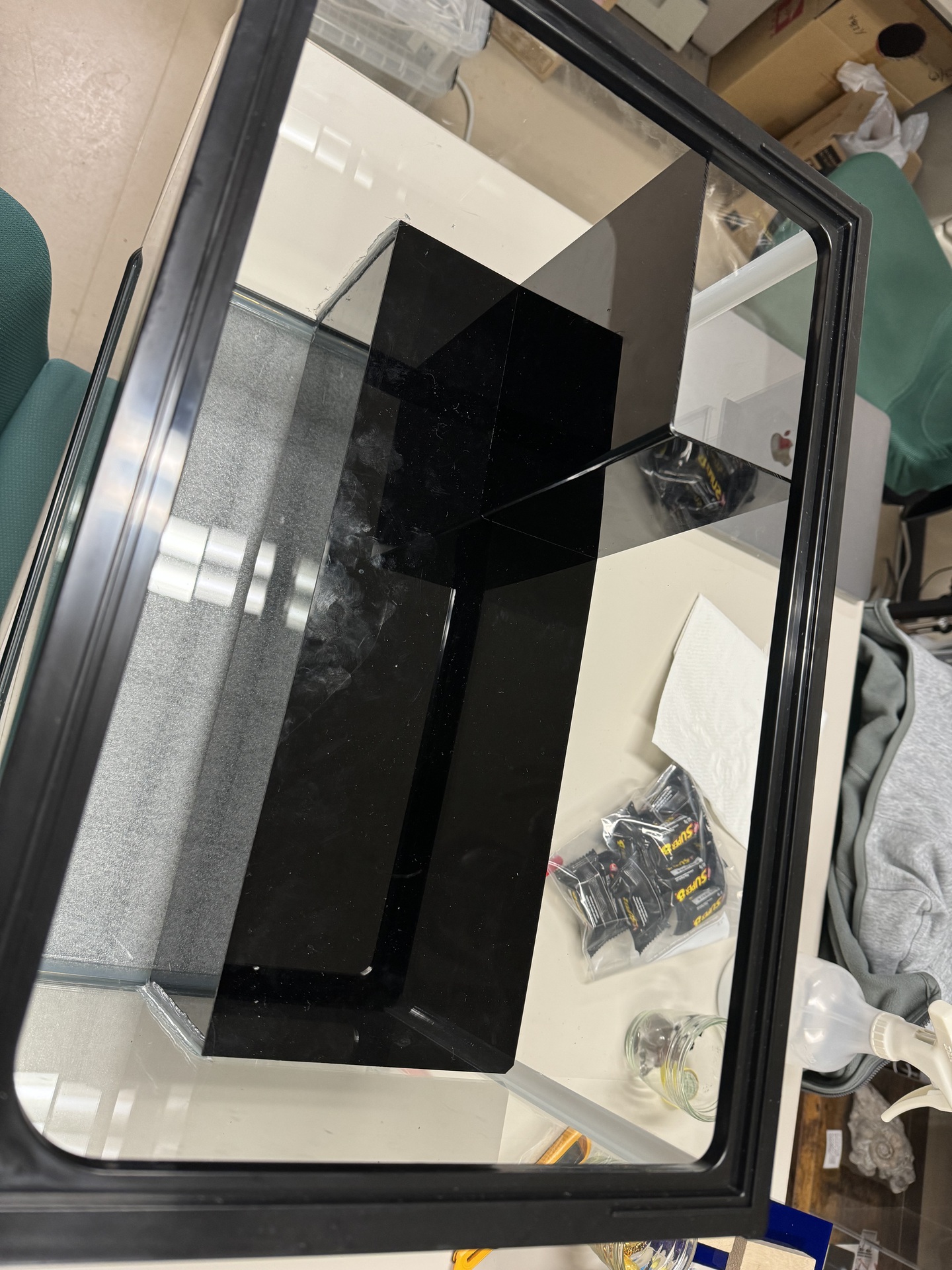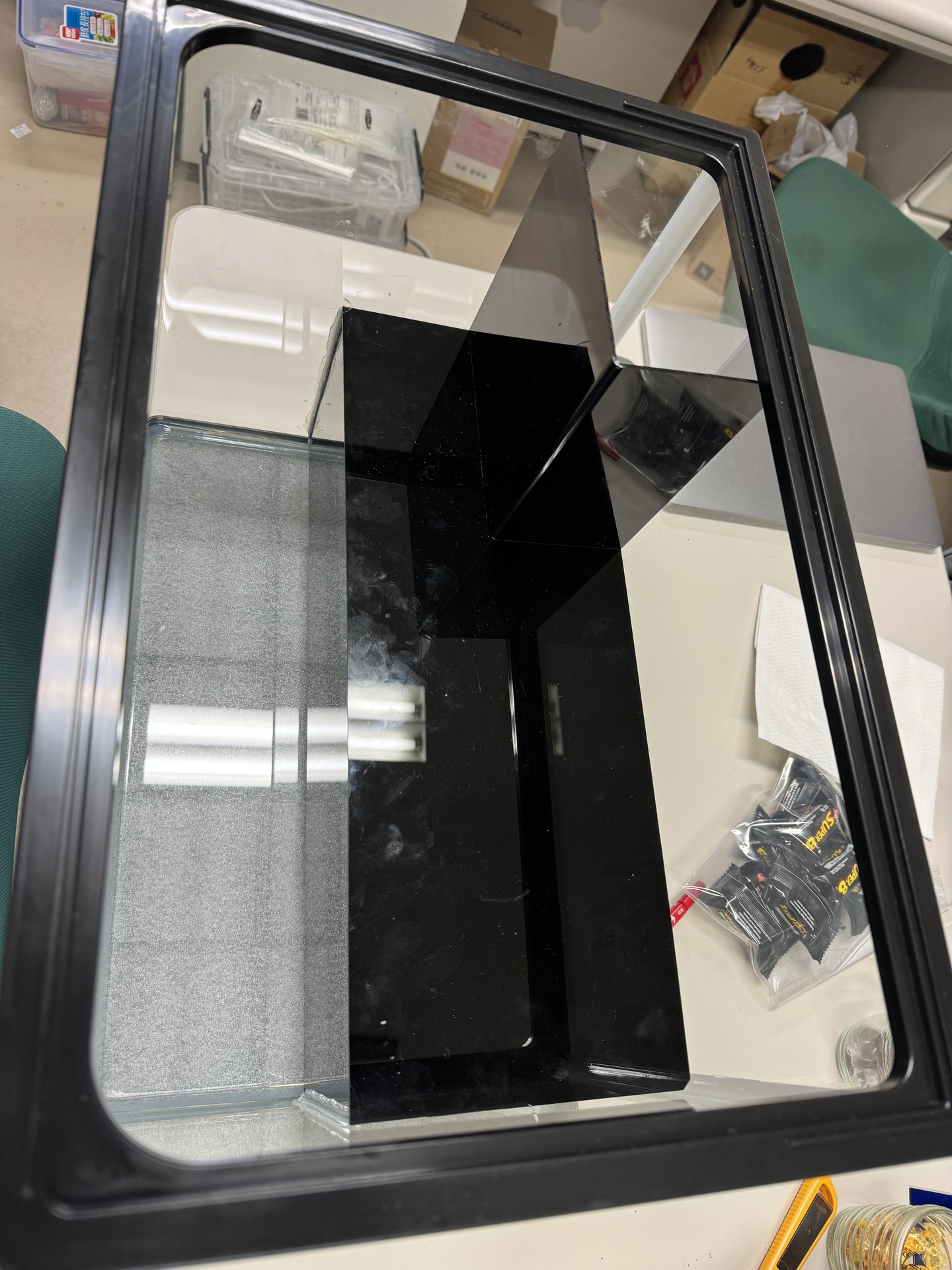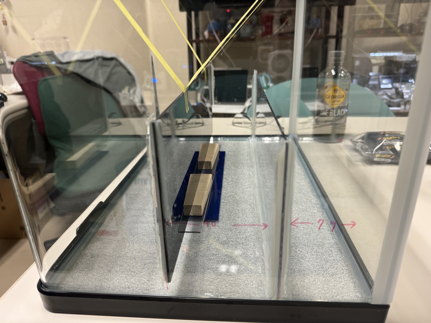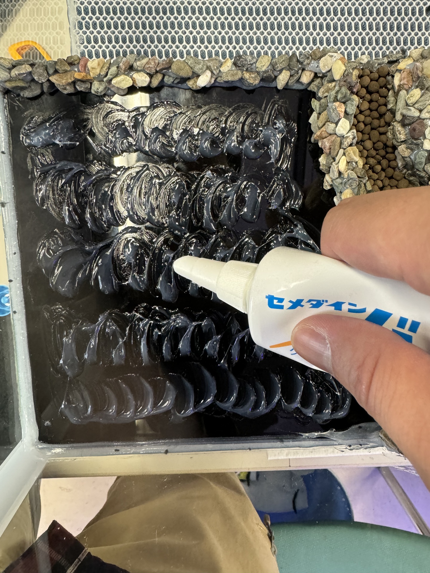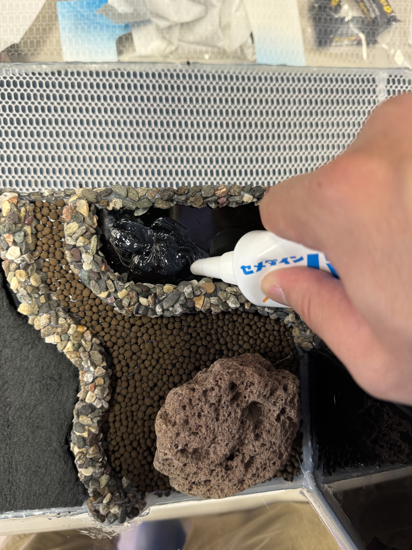 3. ④を水槽の背面から7.9cmの部分に接地し(接地の角は,あらかじめ少し削っておきます),接着材で固定します。