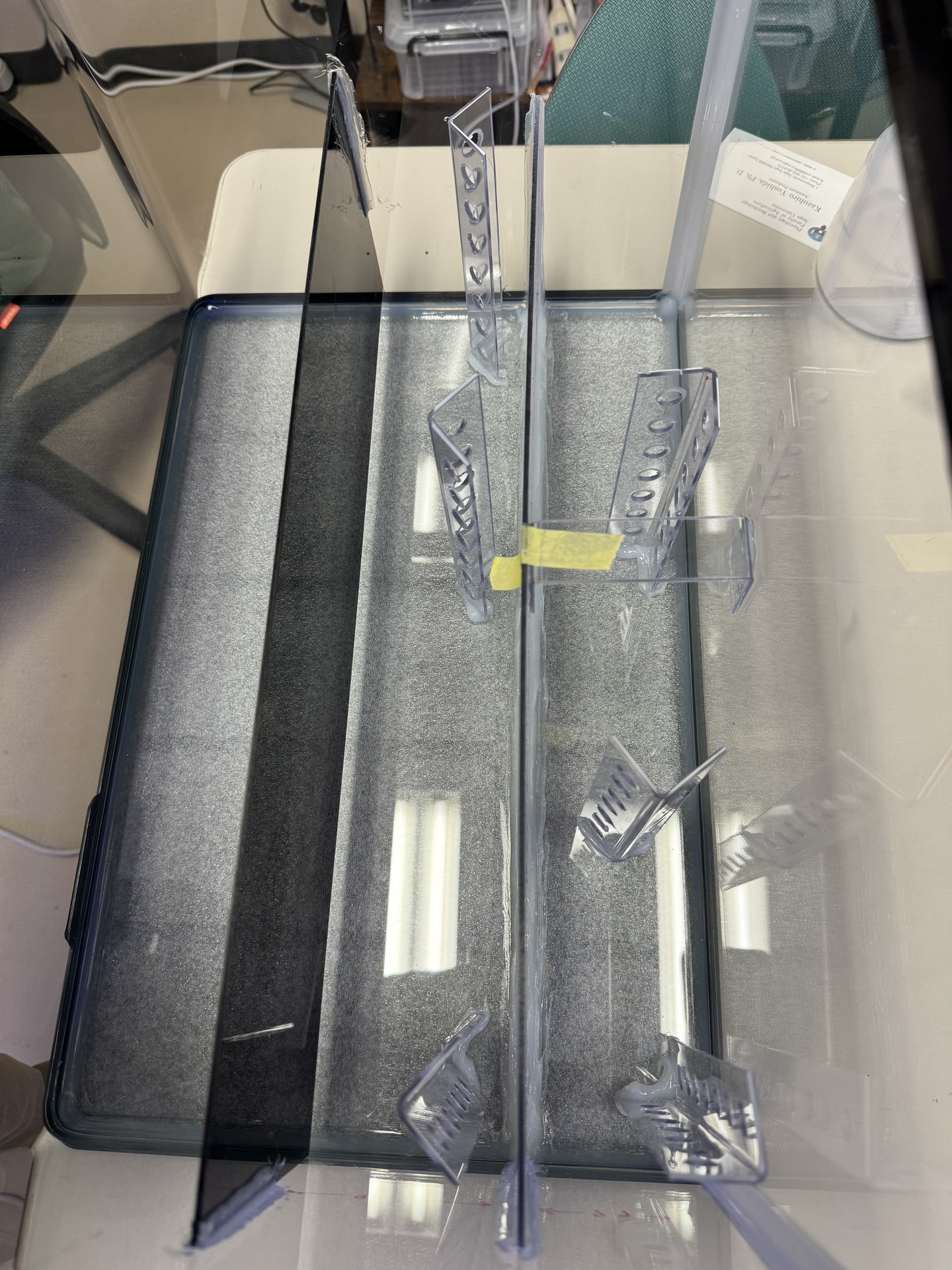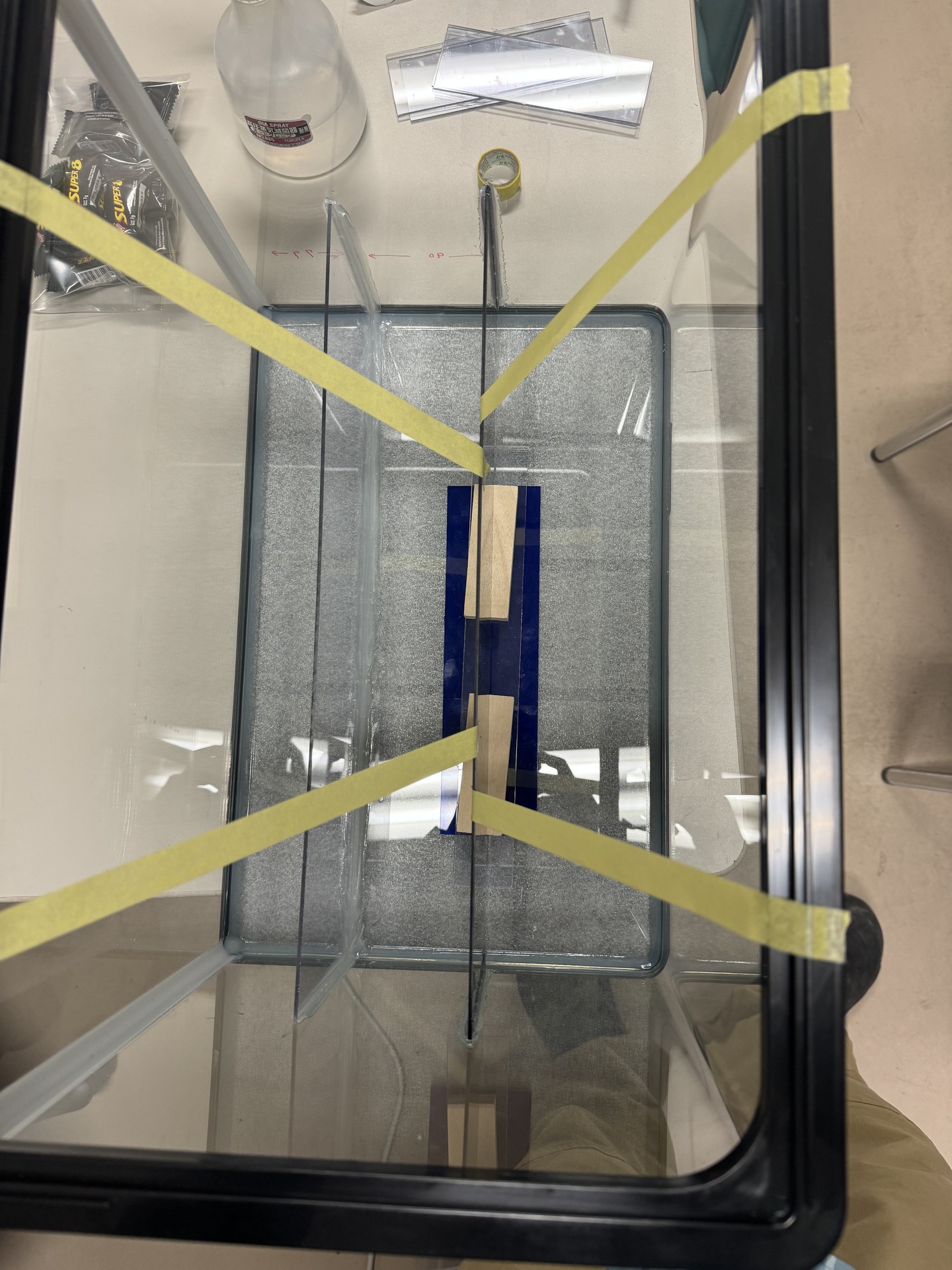- アクリルカッター,接着剤(バスコーク),電動ドリル,マスキングテープ,アクリルを曲げるヒーター