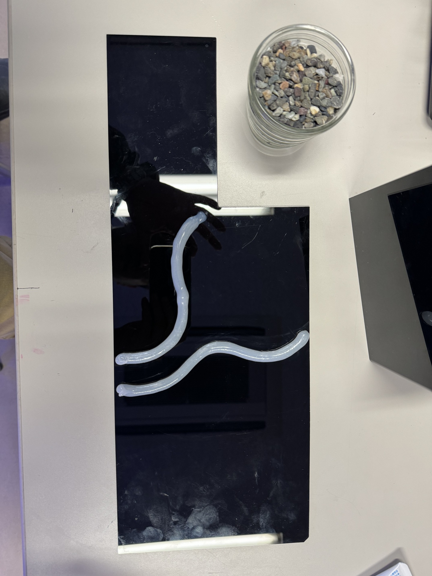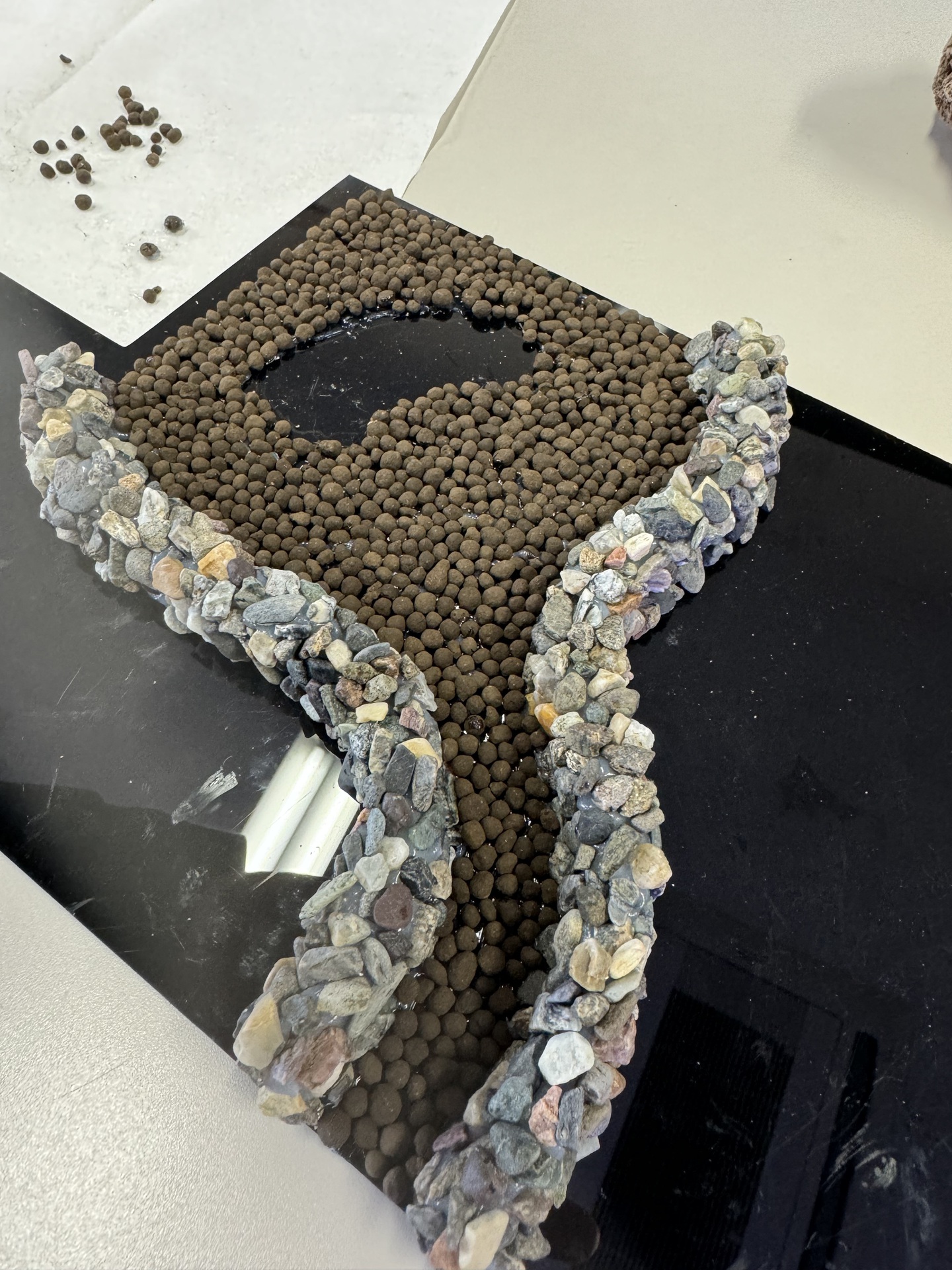 8. ①の板に,接着剤と砂利,丸粒土をつかって,水路をつくります。