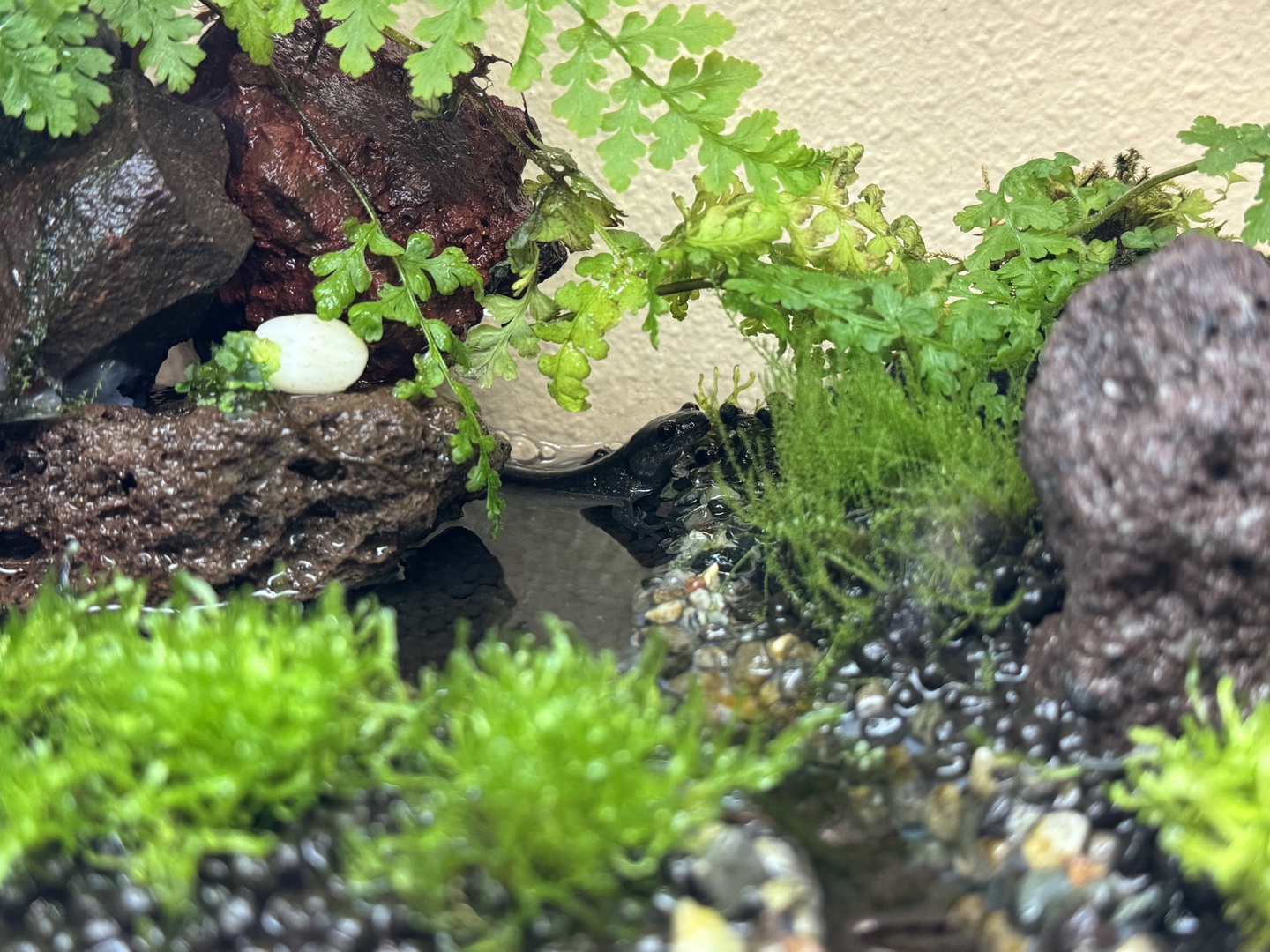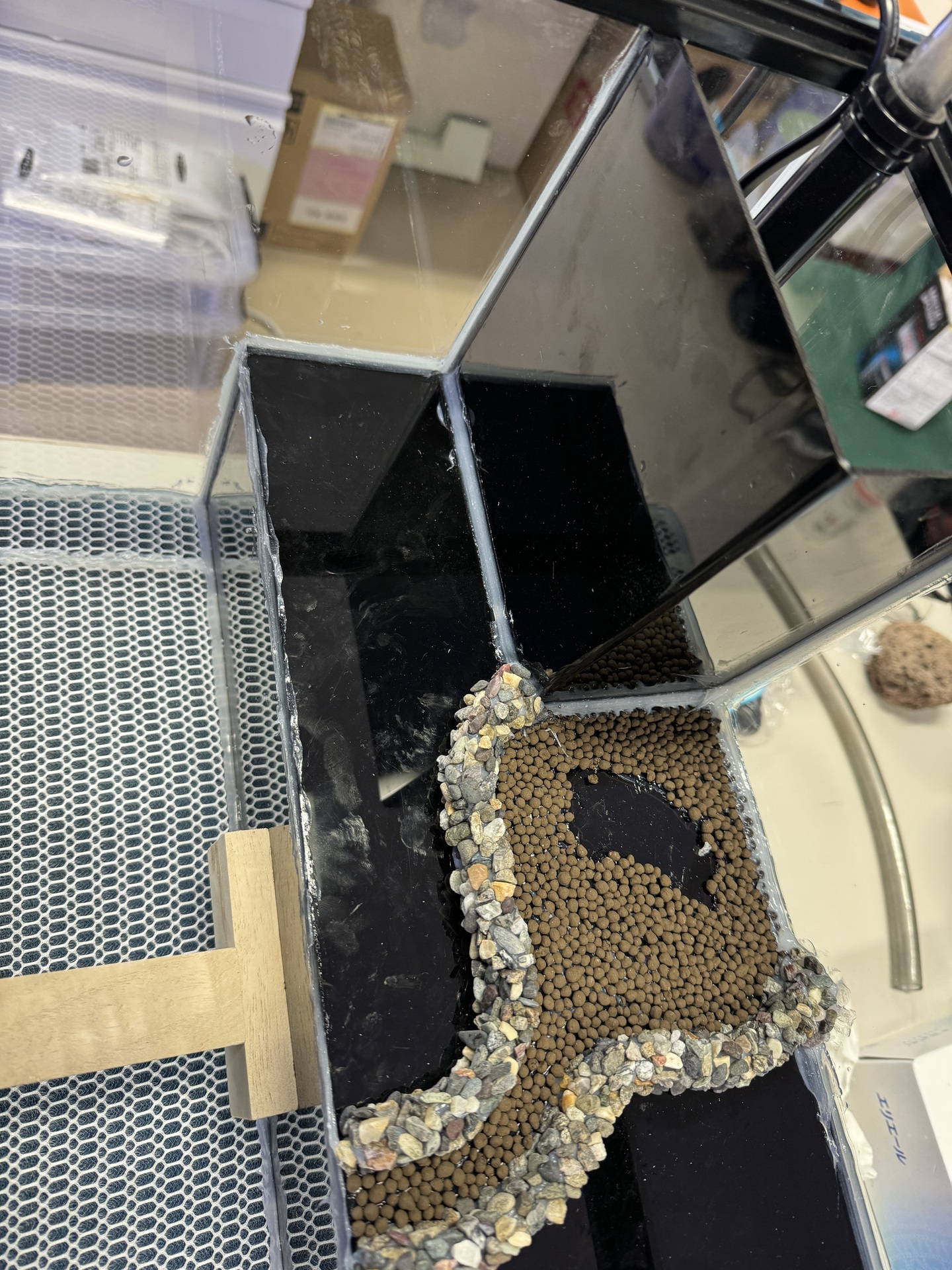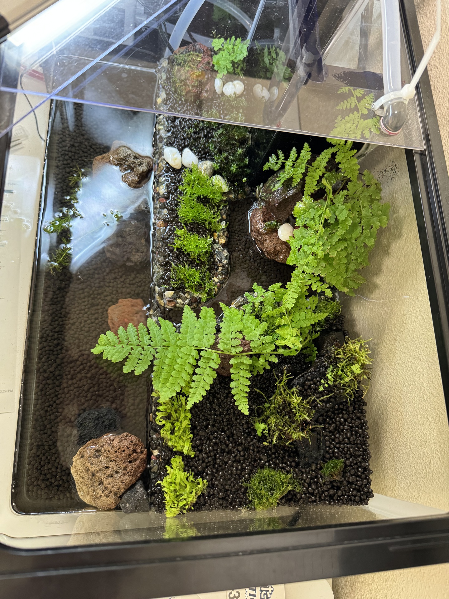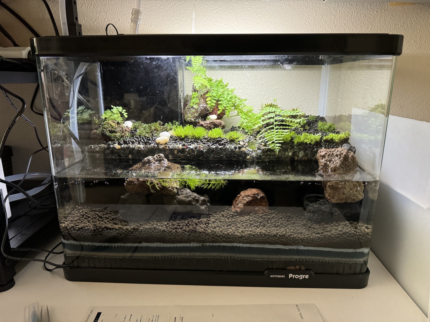 8. 完成です。丸粒土をいれ,コケやシダを植えてから,ポンプを動かして,1,2ヶ月間放置します。コケが根付いたら,生体をいれます。