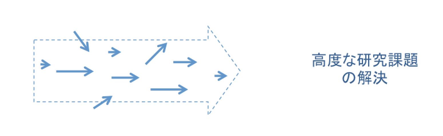 博士課程(標準:3年間)をいくつかの期間に区切り,各々にテーマを設定し,各テーマが完結できるような研究計画を作るように指導します。「完結」とは,小さくても,(サイエンスの発展に貢献する)新しい結果(解釈・知見)を出し,論文として出版することです。研究の全体像として,下図のように,「大小の研究を多角的に用いて,結果として長期間の研究を必要とする高度な研究課題の解決を目指す」ことを念頭に,博士課程での研究が,その基礎になるように設定します(下記イメージ)。