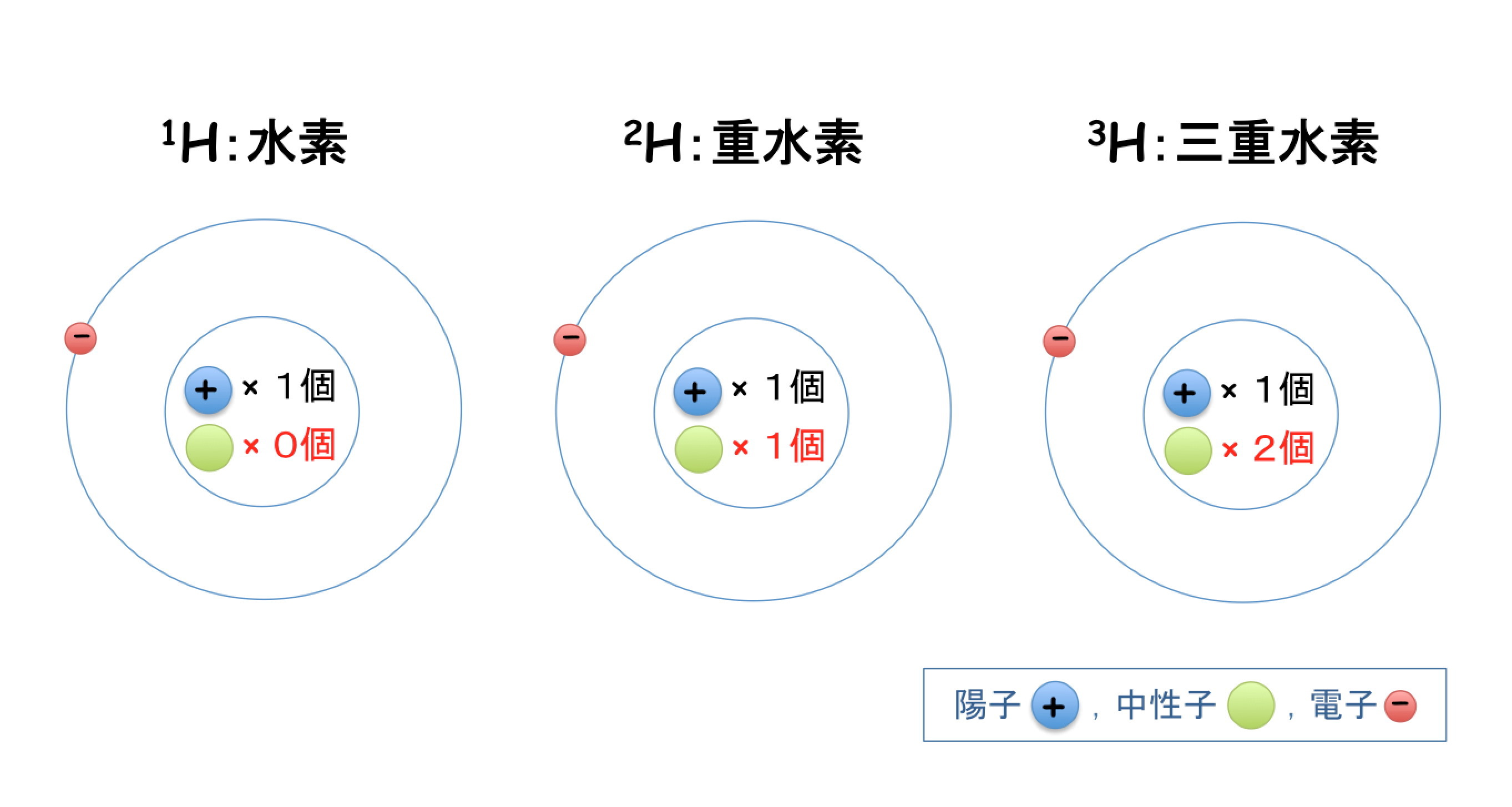 同位体(isotope)とは,同一の原子番号を持ち(陽子数は等しい),中性子数が異なる原子です。例えば,水素には,水素,重水素,三重水素の3つの同位体があり,水素と重水素が,放射性崩壊により他の核種に変化することのない「安定同位体」,三重水素が,放射性崩壊により他の核種に変化する「放射性同位体」です。