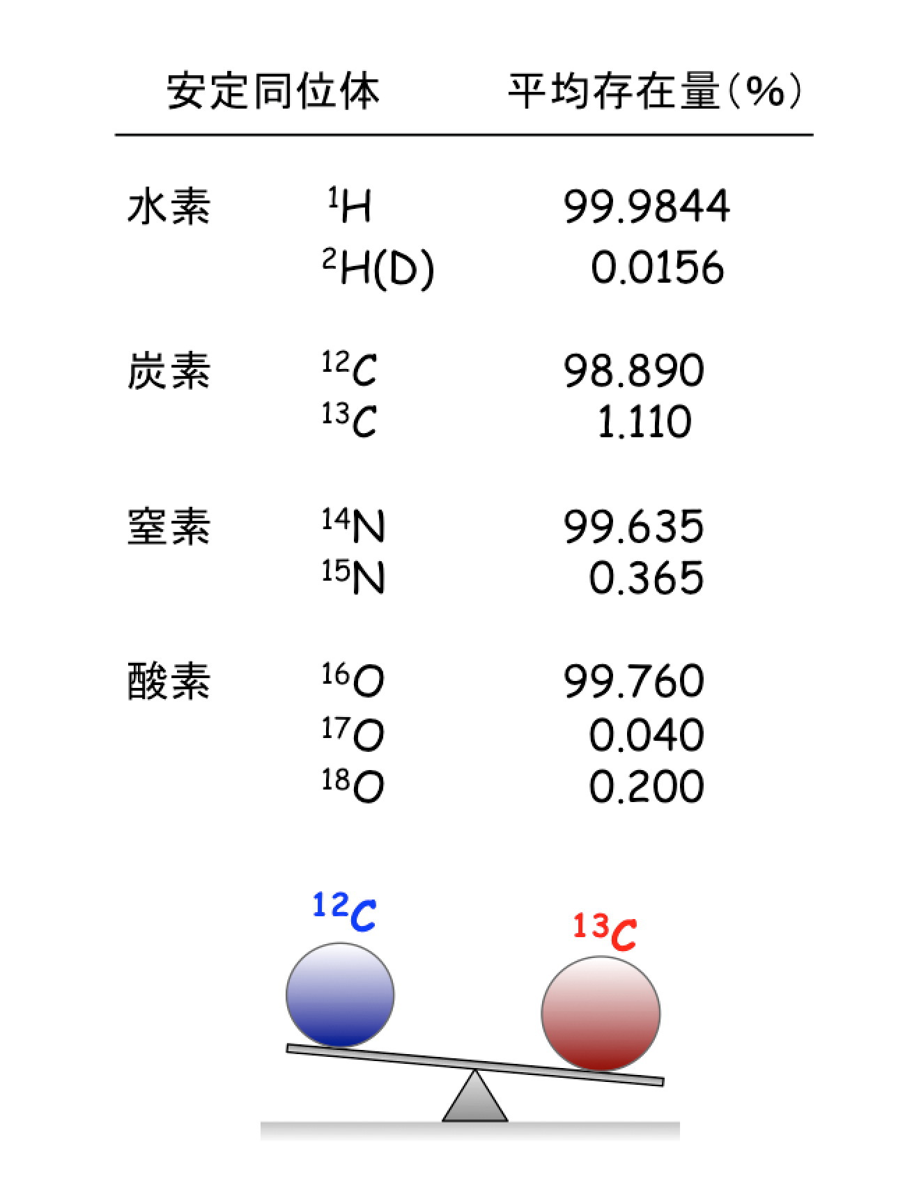 しかし,「平均存在量」とあるように,これらの存在量は,地球上の様々な物質・生物で多様性とバリエーションを持っています。例えば,炭素では,13C/12C = 0.011xx の少数点以下4,5桁の「xx」の部分が,物質・生物により異なる値を示します。