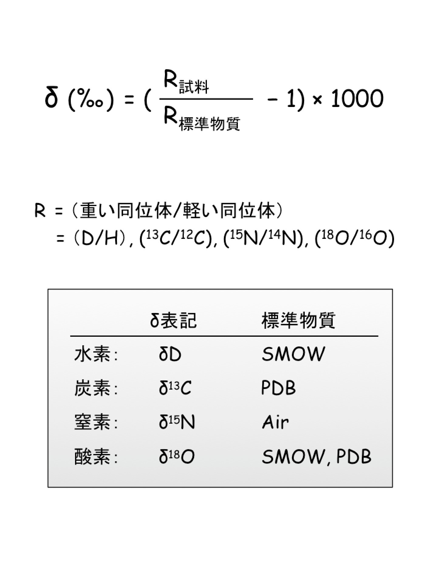これらの元素の安定同位体存在量は,歴史的な事情と技術的な制約により,同位体比(R)を用いるうえ,δ(デルタ)という,国際標準物質(標準物質)の同位体比に対する試料の同位体比の千分率(単位:‰、パーミル)という,直感では非常に掴みにくい指標を使って表記します。
