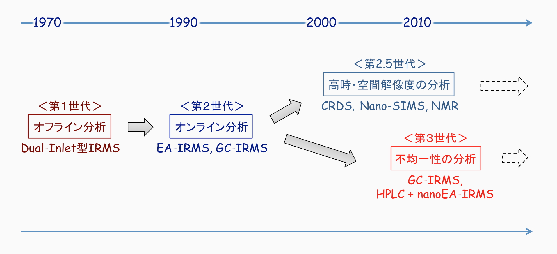 有機物(有機化合物)の安定同位体比の測定法は,Dual inlet型IRMSを使用する<第1世代分析>,EA-IRMSやGC-IRMSを使用する<第2世代分析>,CRDS, Nano-SMIS, NMRを使用する<第2.5世代分析>,そして,GC-IRMSや,HPLC + nanoEA-IRMSを駆使して化合物間や単一の化合物の中の異なる元素間の同位体的不均一性を調べる<第3世代分析>と発展してきました。