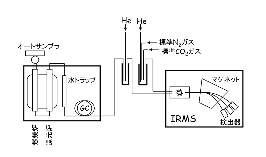 のフローで,試料に含まれる全炭素・全窒素のガス化,異なる種類のガス(例えば,二酸化炭素ガス)のGC分離,同位体比の測定の順で分析が行なわれるため,試料全体に対して,複数の元素(例えば,炭素と窒素)の同位体比を,ほぼ同時に測定することがでできます。