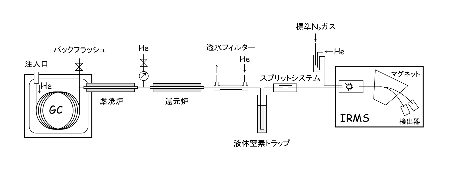 試料導入 → GC → ガス化 → IRMS