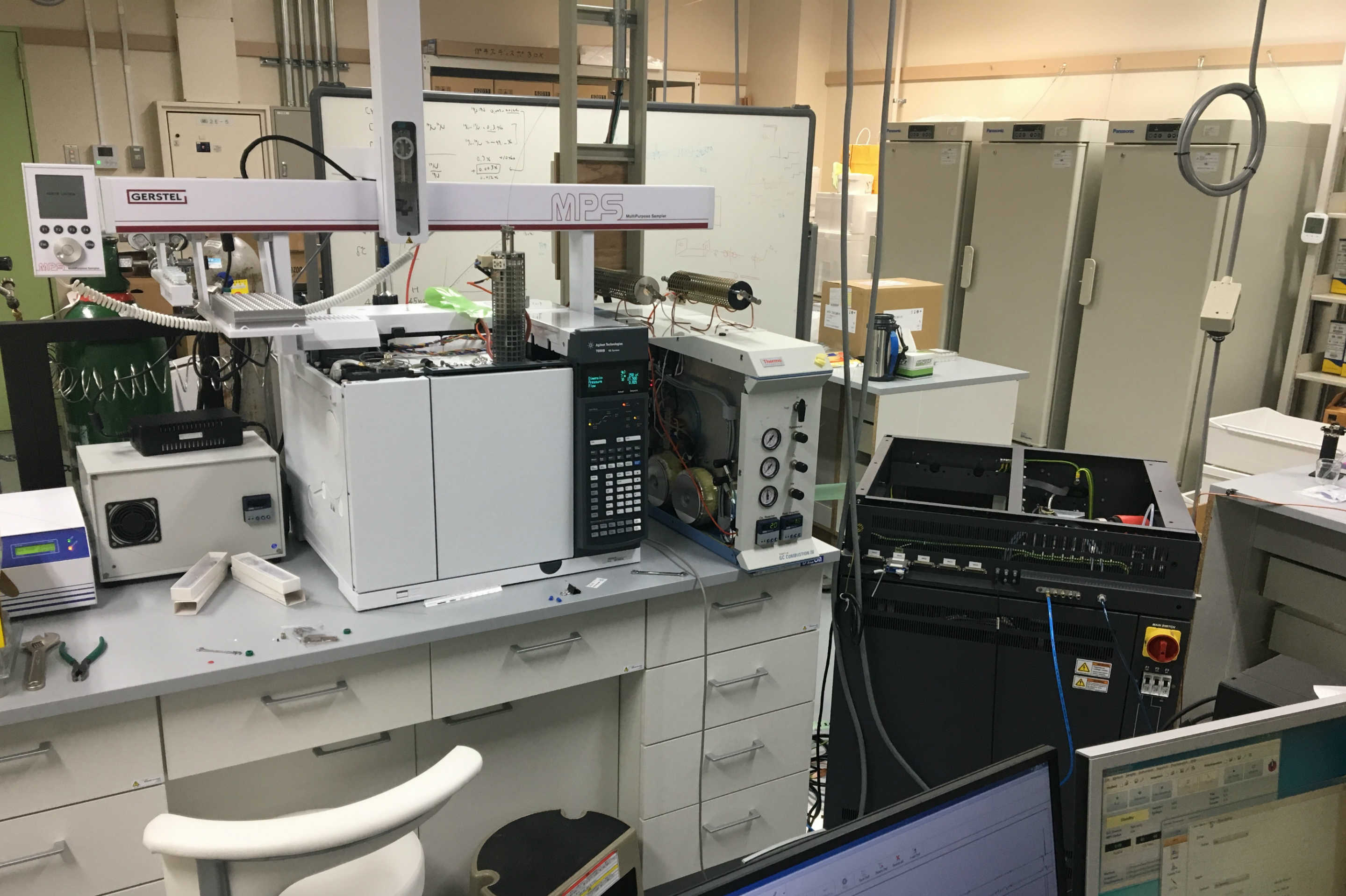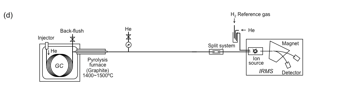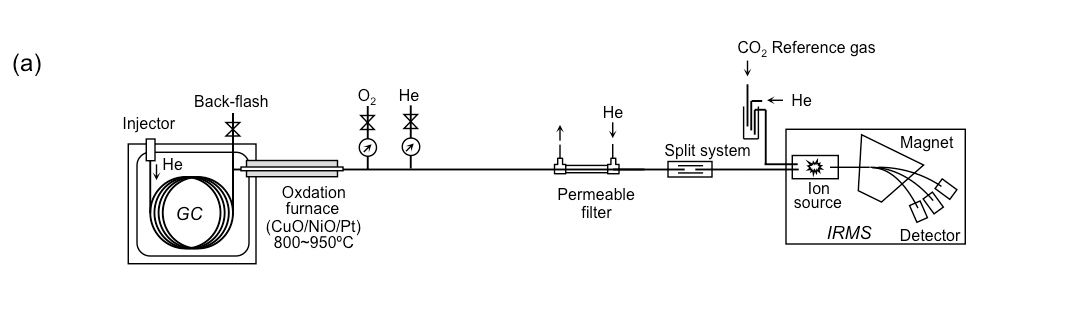 ガスクロマトグラフ-同位体比質量分析計(GC-IRMS: Gas Chromatograph - Isotope Ratio Mass Spectrometer)は,有機化合物や,その一部の元素の安定同位体比を測定する装置です。