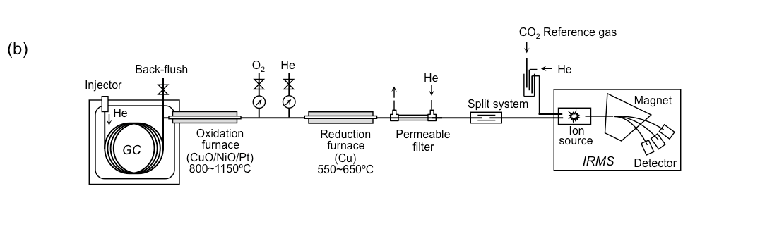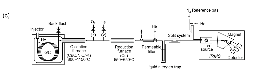上記(a)に加え,還元炉を設置する。有機化合物は,燃焼炉でCO2・H2O・NOxに分解され,その後,NOxを還元炉でN2ガスに変換する。透水フィルターでH2Oを除去した後,CO2とN2がIRMSに導入される。