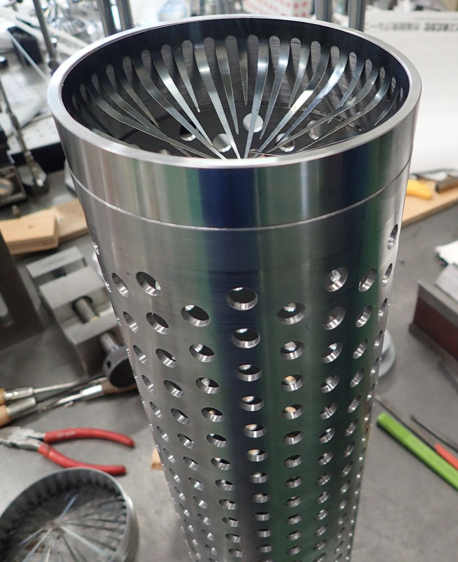 第三期南極ドームふじ深層掘削において使用する、ボアホールカメラ(掘削孔底撮影装置)と、掘削孔底の氷片回収装置の製作を行いました。ボアホールカメラは液封液で満たされた最深部およそ3000mの掘削孔での使用を可能にするため、40MPaに耐えられるように耐圧容器を設計・製作しました。その中に収納したカメラは3500mのケーブルを伝送線として使用し、孔底で自動撮影された画像を地上でリアルタイムモニタする制御システムの開発も行いました。また、掘削孔の底に氷片が溜まり、掘削ドリルが進まなくなった時に使用するため氷片回収器の製作も行いました。